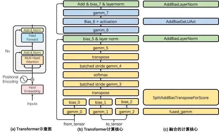 让我们先看看Transformer都包含了什么计算。如下图所示,图(a)展示了论文Transformer结构示意图,这里称灰色方框内的结构为·一个Transformer Cell,BERT encoder堆叠了Nx个这样的Transformer Cell。图(b)将一个Cell的细节加以展开,每一个矩形都是一个独立的计算核心。