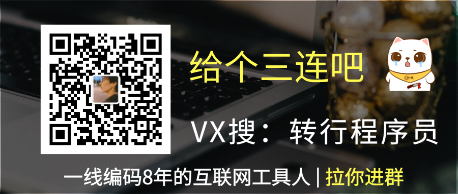 VX搜索【转行程序员】回复”加群“,我会拉你进技术群。讲真的,在这个群,哪怕您不说话,光看聊天记录也是一种成长。阿里/腾讯/百度资深工程师、Google技术大神、IBM工程师、还有我王炸、各路大牛都在,有任何不明白的都进群提问。