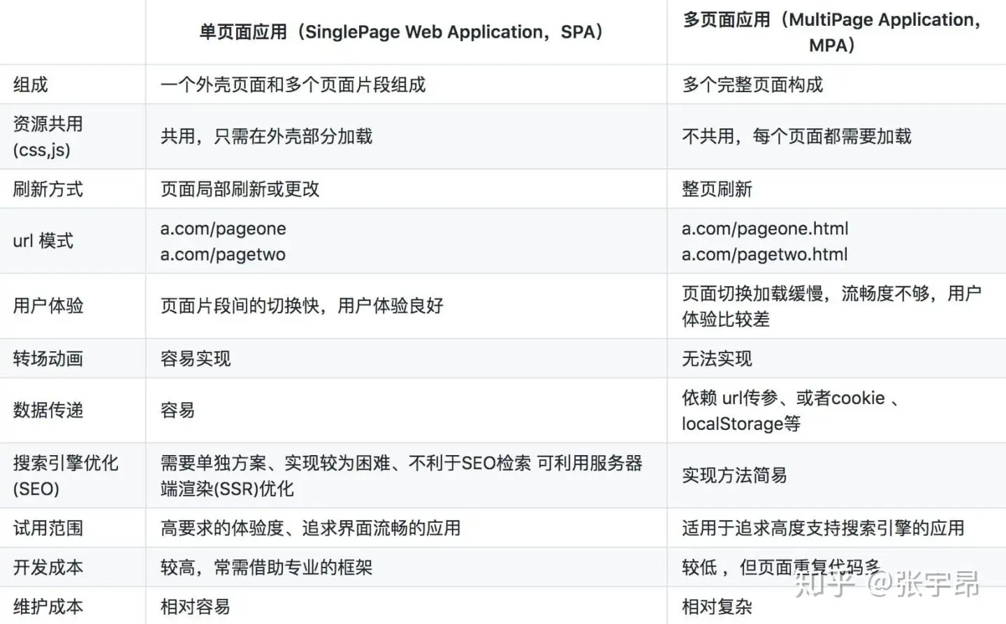 我们支持单页面应用(SPA)和多页面应用(MPA)两种常见的应用类型的开发。 关于SPA与MPA的区别如下(本表格转载自网络,如有侵权请提issue联系)