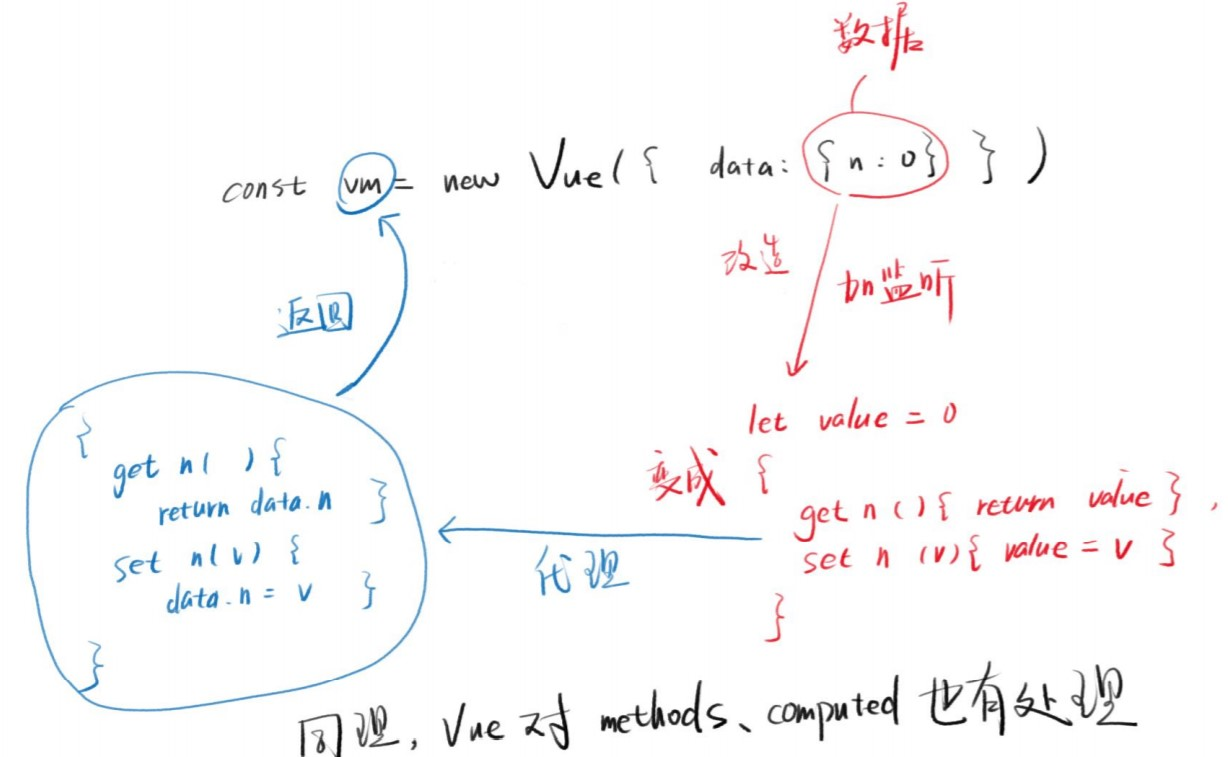 当修改 vm.n 或 data.n 时,render(data...) 中的 n 就会做出响应。响应这个联动的过程就是 vue 的 数据响应式。