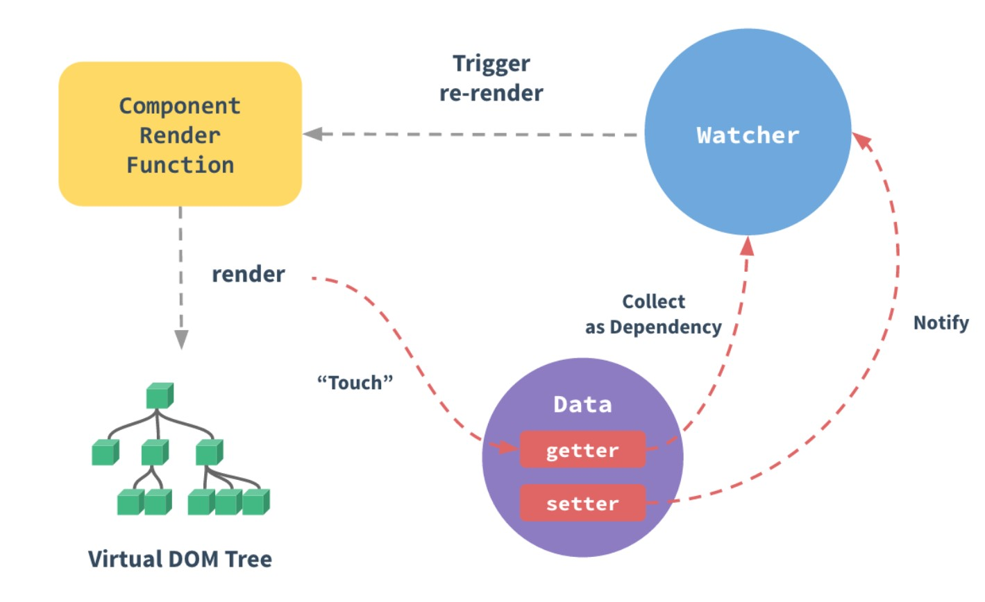 每个组件实例都对应一个watcher实例,它会在组件渲染的过程中把“接触”过的数据属性记录为依赖。之后当依赖项的setter触发时,会通知watcher,从而使它关联的组件重新渲染。