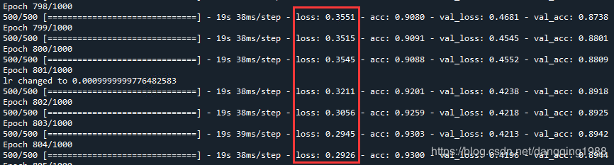 此外还发现,如下图所示,在学习率为0.01的时候,原本loss都不下降了,一直在0.35左右波动;当学习率下降为0.001的时候,loss瞬间降到了0.32,紧接着又降到了0.29。似乎降低学习率很有利于loss下降。