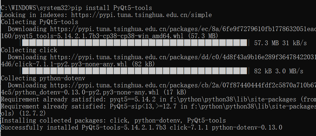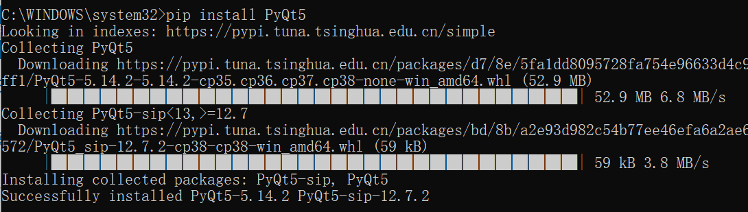 分别运行 pip install PyQt5 、pip install PyQt5-tools,等待完成安装 PyQt5