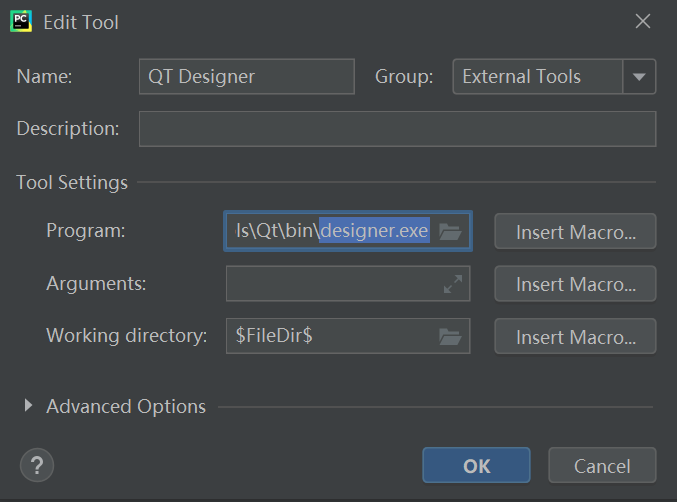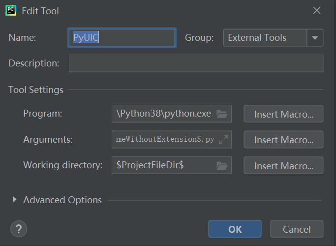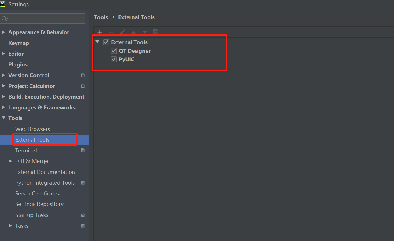 在 PyCharm File | Settings | Tools | External Tools 点击 “+”添加,如图,这里我是添加完成的,QT Designer 是 PyQt5 界面编辑工具, PyUIC 是将 PyQt5 编辑好的页面 .ui 文件转化成 .py 文件的工具。