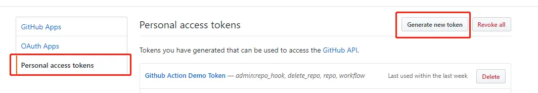 第一件事情是我们需要先创建一个 GitHub 密钥,因为我们需要将示例部署至 Github Page ,需要写权限,创建完成后将这个秘钥保存在当前仓库的 Settings/Secrets 里面。