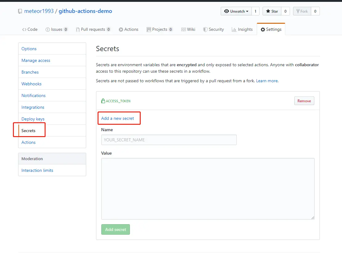 接下来,创建一个项目,我这里创建的名字叫做 github-actions-demo ,然后点击项目中的 Settings ,在 Secrets 的栏目中将刚才创建的 Token 填写进去: