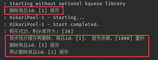 缓存再删除线程 */ private class delCacheByThread implements Runnable { private int sid; public delCacheByThread(int sid) { this.sid = sid; } public void run() { try { LOGGER.info("异步执行缓存再删除,商品id:[{}], 首先休眠:[{}] 毫秒", sid, DELAY_MILLSECONDS); Thread.sleep(DELAY_MILLSECONDS); stockService.delStockCountCache(sid); LOGGER.info("再次删除商品id:[{}] 缓存", sid); } catch (Exception e) { LOGGER.error("delCacheByThread执行出错", e); } } }