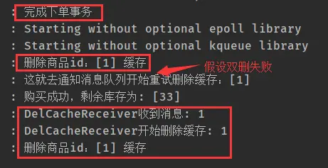 可以看到,我们先完成了下单,然后删除了缓存,并且假设延迟删除缓存失败了,发送给消息队列重试的消息,消息队列收到消息后再去删除缓存。