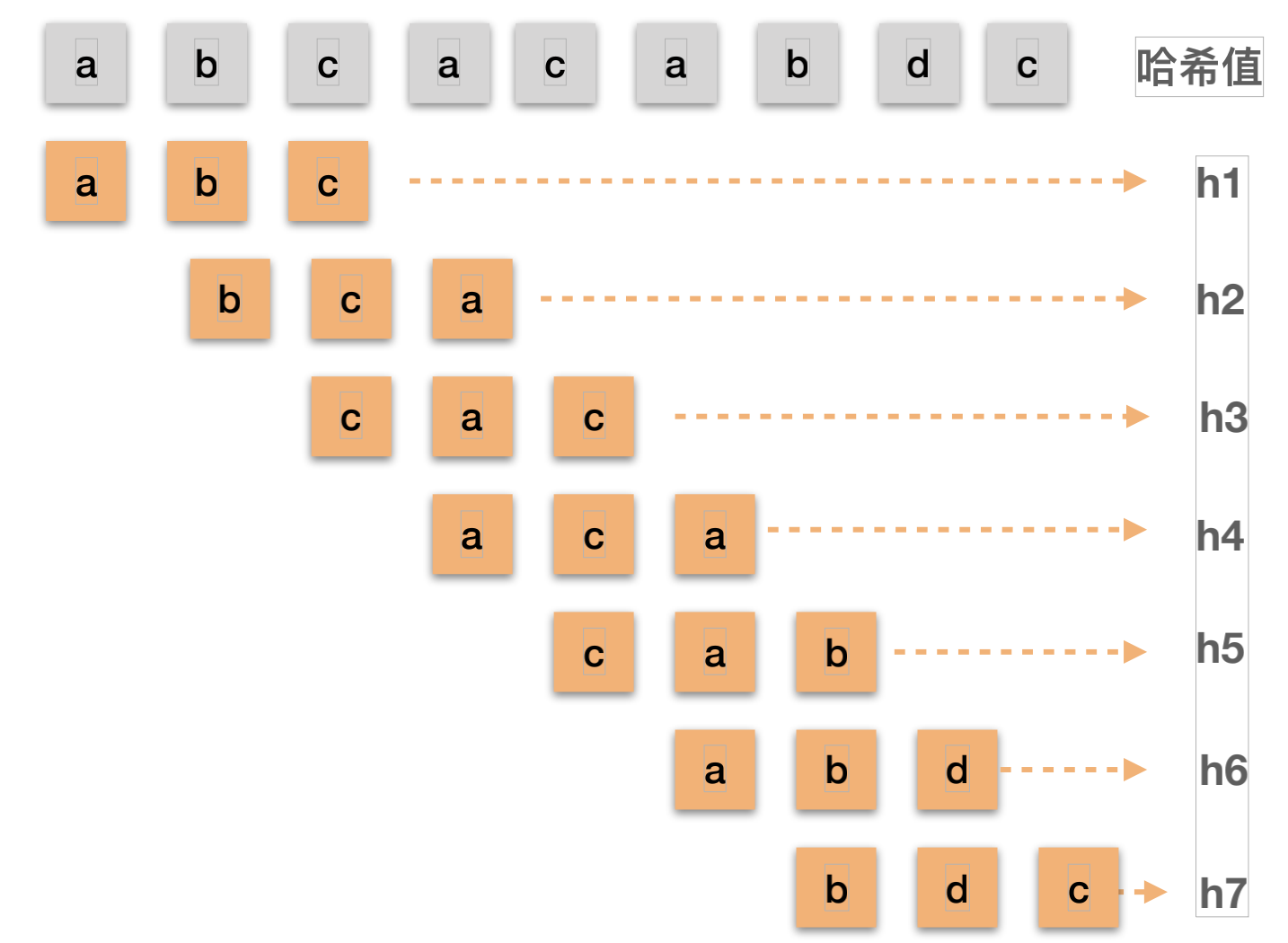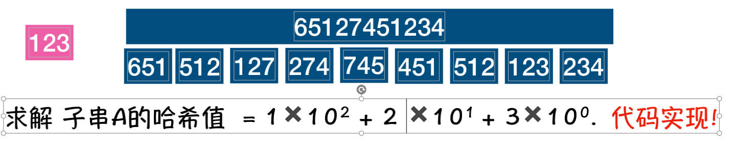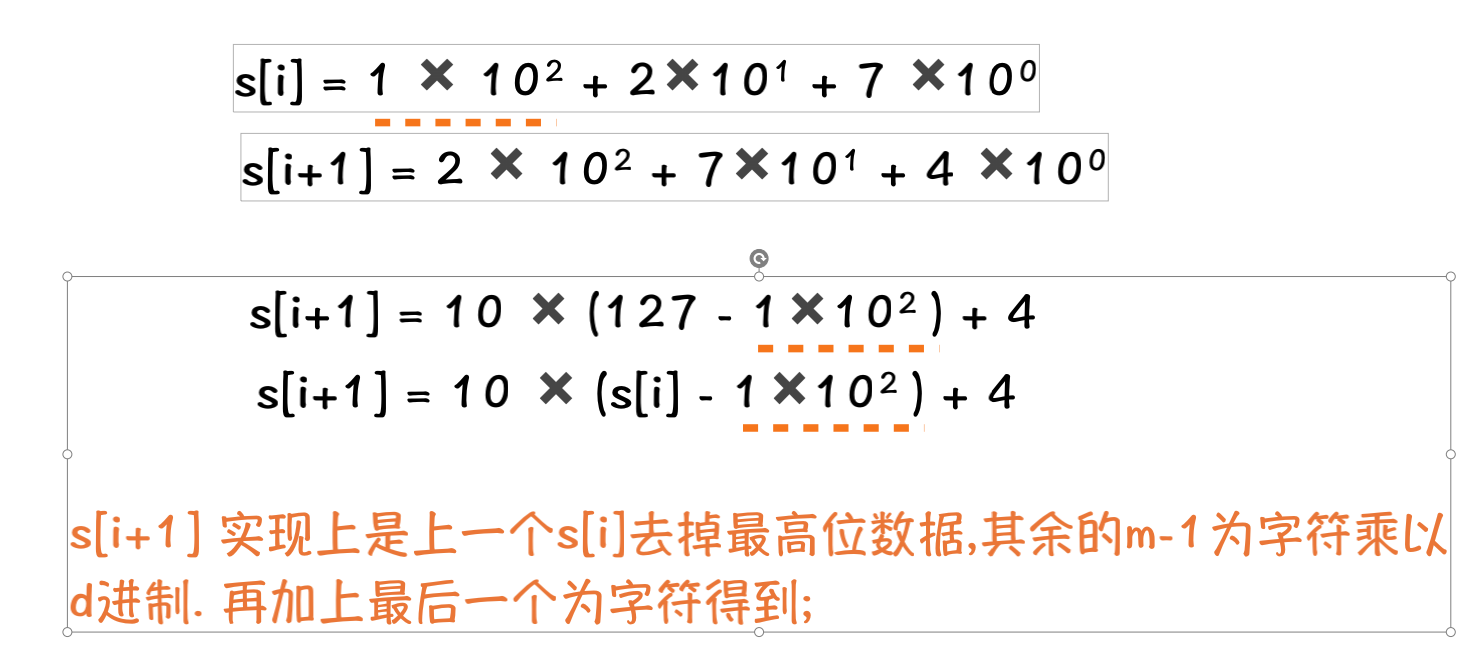 相邻的2个子串s[i]与s[i+1](i表示子串从主串中的起始位置,子串的长度都为m).对应的哈希值计算公式有交集.也就说我们可以使用s[i-1]计算出s[i]的哈希值;
