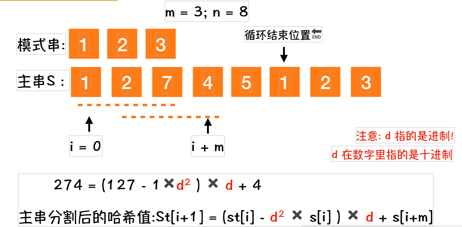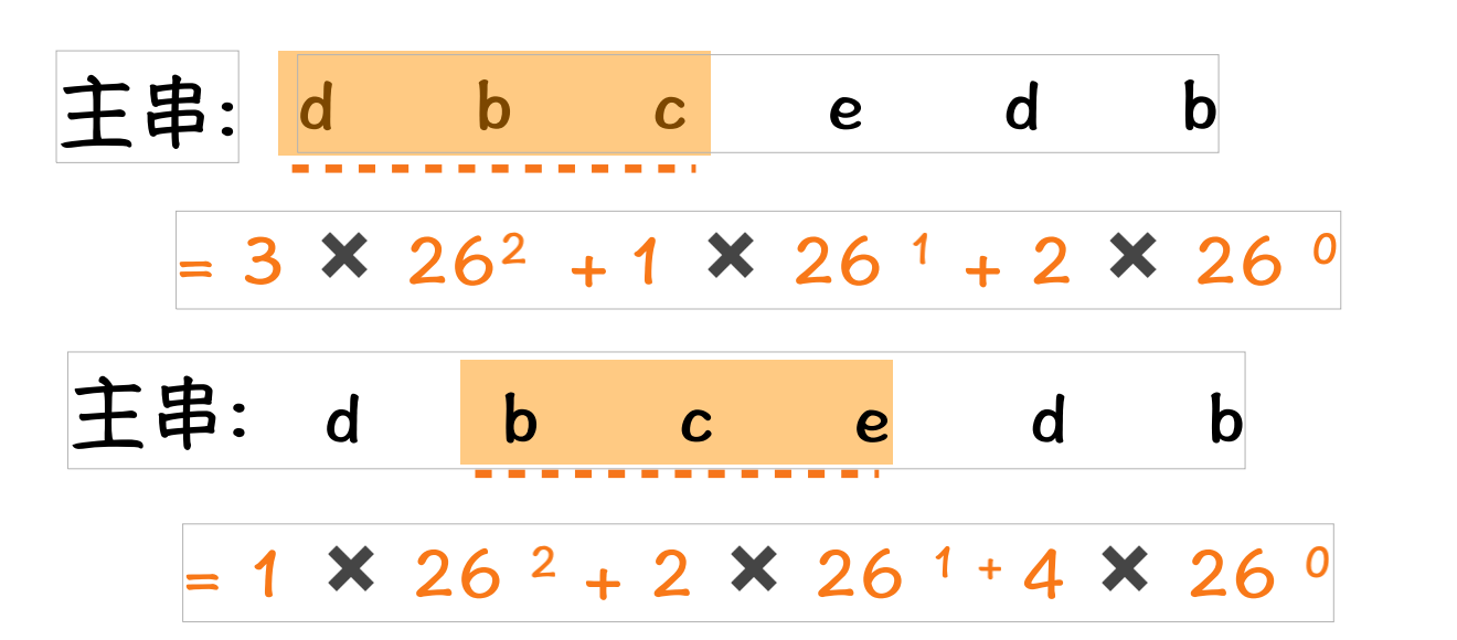 //④ 在对比过程,并不是一次性把所有的主串子串都求解好Hash值. 而是是借助s[i]来求解s[i+1] . 简单说就是一边比较哈希值,一边计算哈希值;