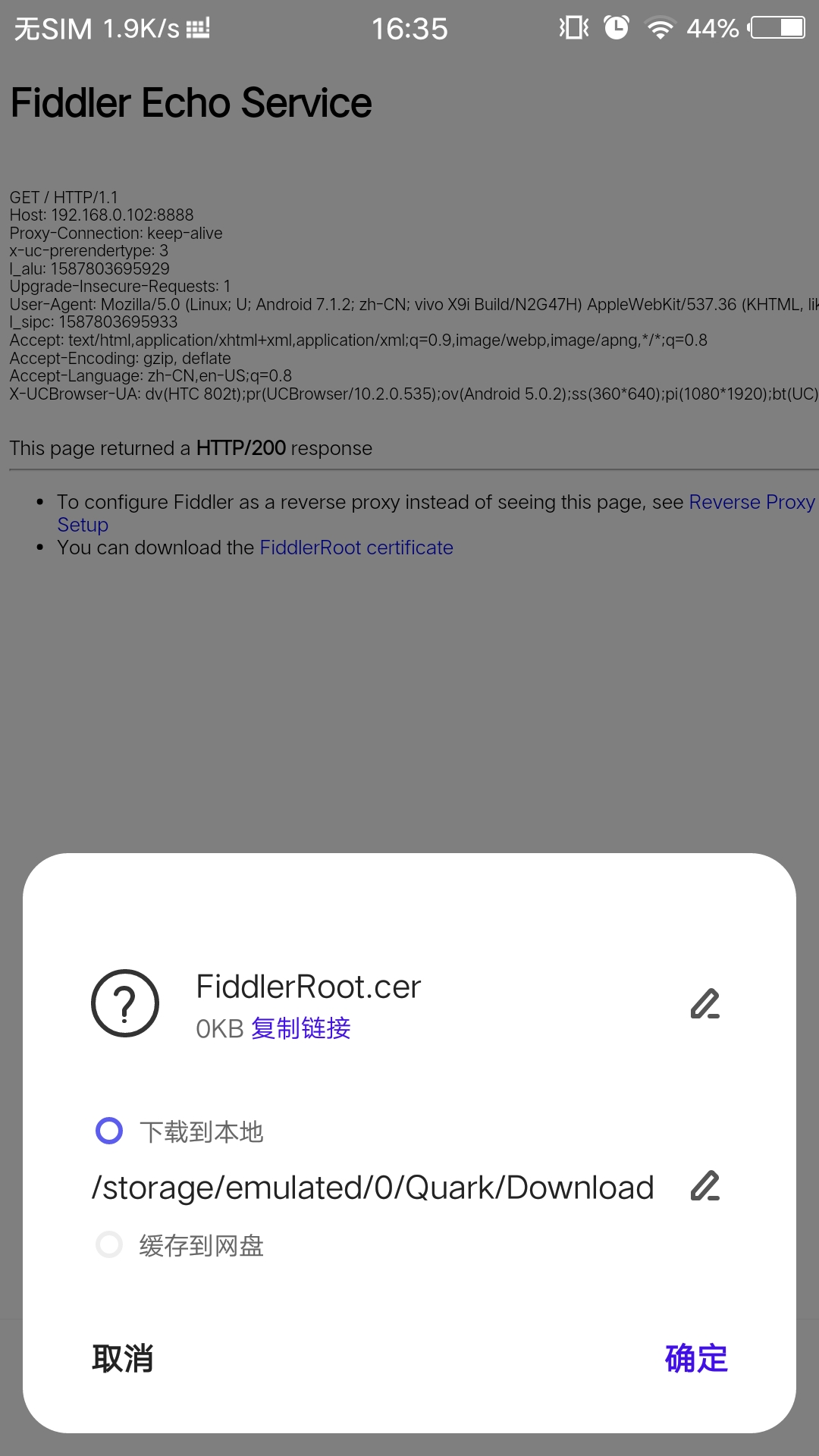 也就是http://192.168.0.xxx:8888 跳转到Fidder Echo Service页面,点击下载Fidder的证书,重命名后使用就行了