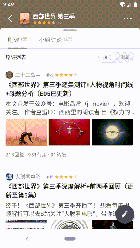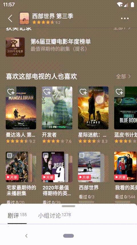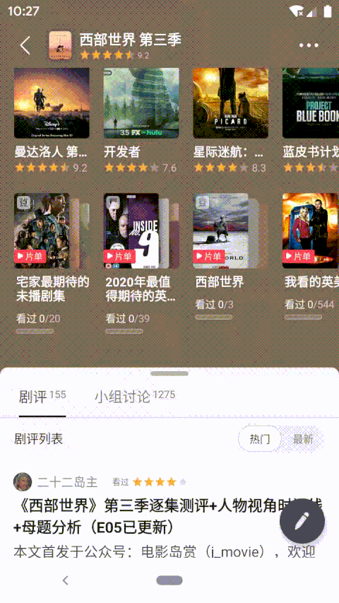 这部分的视图「看起来」是一个大列表,里面有影片的信息(这里以电视剧为例)、豆瓣评分、剧情介绍、演职员表、剧照、短评和其他等卡片。下面还塞了影评的视图,由一个剧评和小组讨论两个 tab 页面(暂不考虑自己的影评部分)组成,里面的内容是一个列表。