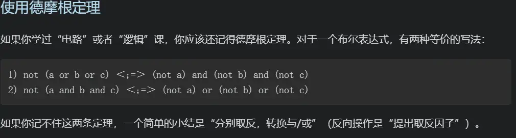 另一个技术是用德摩根定理来操作逻辑表达式——这个技术有时可以把布尔表达式用更整洁的方式重写(例如if (!(a && !b))变成if (!a || b))
