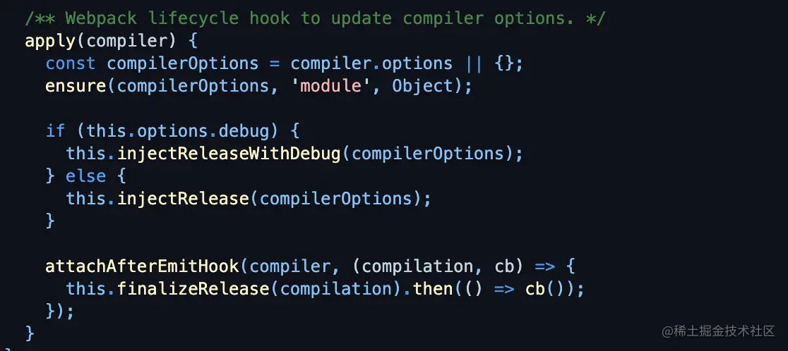 - 另外一个就是@sentry/webpack-plugin是作为plugin在webpack中使用的,在webpack官方文档中,是这么介绍的:webpack 插件是一个具有 apply 方法的 JavaScript 对象。apply 方法会被 webpack compiler 调用,并且 compiler 对象可在整个编译生命周期访问。所以,完全可以在外部定义@sentry/webpack-plugin实例,做我们需要的操作,直至webpack运行这个插件实例时,才会调用apply方法