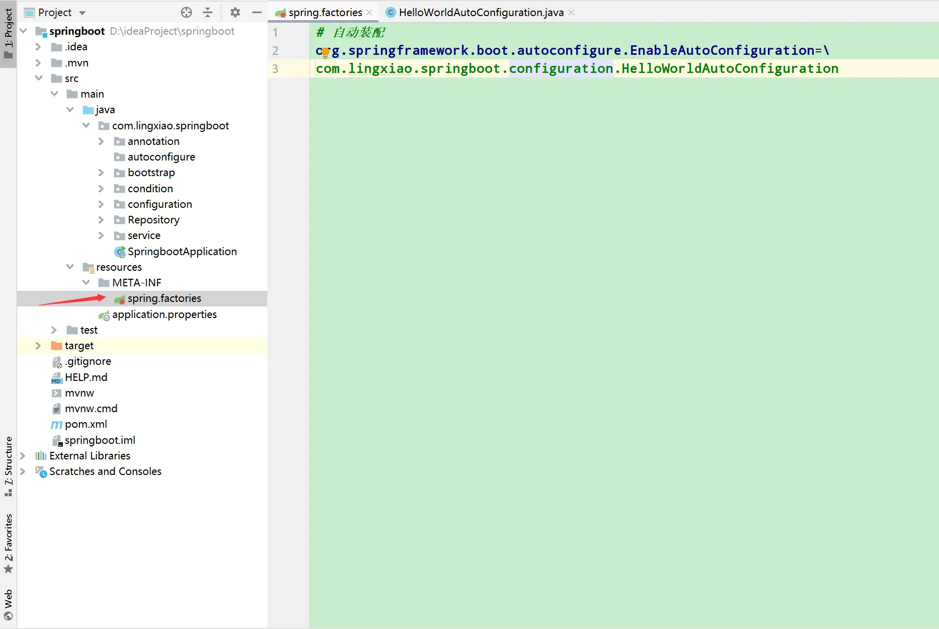 @EnableAutoConfiguration激活自动装配,Spring Boot会去spring.factories文件中解析需要自动装配的类HelloWorldAutoConfiguration - 装配