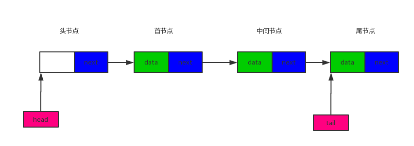 下图中绿色部分是数据域, 蓝色部分是指针域。首尾节点:链表中第一个节点是首节点,最后一个节点是尾节点。