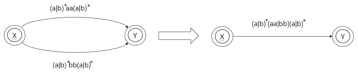 有限自动机转化为正规式,核心是构造一个开始状态 X 和一个终止状态 Y,之后不断简化与合并状态转化的过程,使得从 X 到 Y 只需要经过一步。