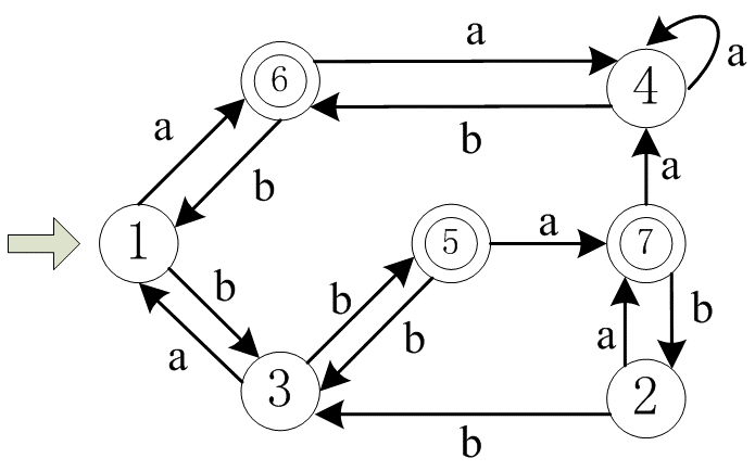 经过 ab 的测试后,当前已划分的状态集合为 {1,2} ,{3},{4} ,{5},{6,7}。