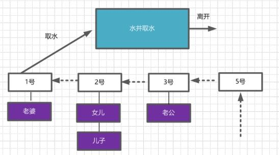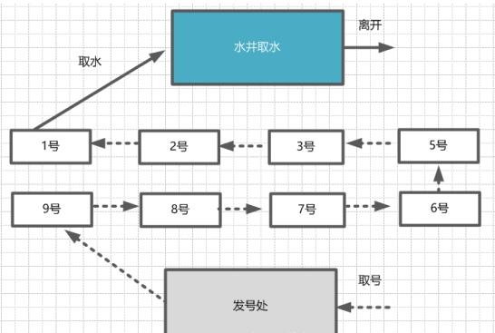 很久以前,在一个村子有一口井,水质非常的好,村民们都抢着取井里的水。井就那么一口,村里的人很多,村民为争抢取水打架斗殴,甚至头破血流。问题总是要解决,于是村长绞尽脑汁,最终想出了一个凭号取水的方案。井边安排一个看井人,维护取水的秩序。说起来,秩序很简单,取水之前,先取号。号排在前面的,就可以先取水。先到的排在前面,那些后到的,没有排在最前面的人,一个一个挨着,在井边排成一队。取水示意图如下 :