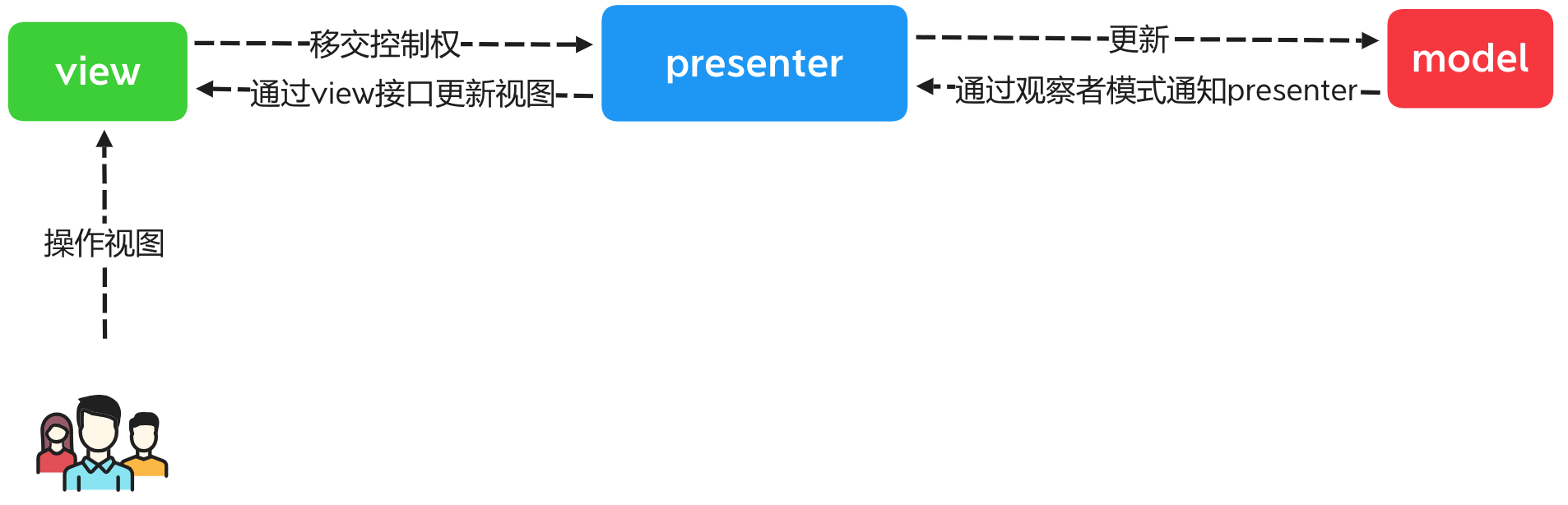view不再负责同步逻辑,而是由present负责,persent既有业务逻辑也有同步逻辑。这和MVC中的view同步逻辑不同,在MVC中是view直接使用model。view需要提供操作用户界面的接口给present调用(非常关键)