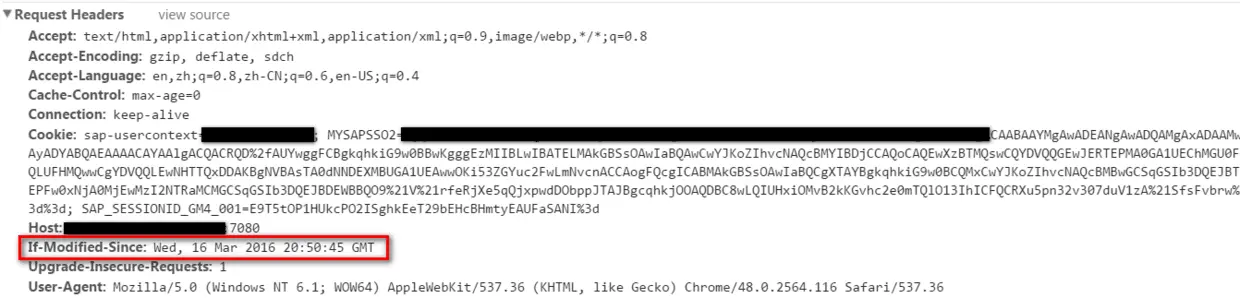 在我的第一轮测试里,因为是第一次请求该文件,HTTP请求头部没有包含If-Modified-Since字段,所以服务器解析出的值为空,即变量lv_modified_since为空。