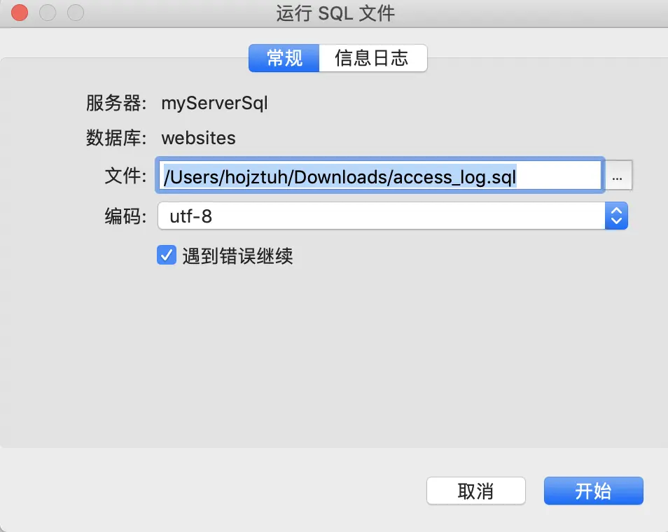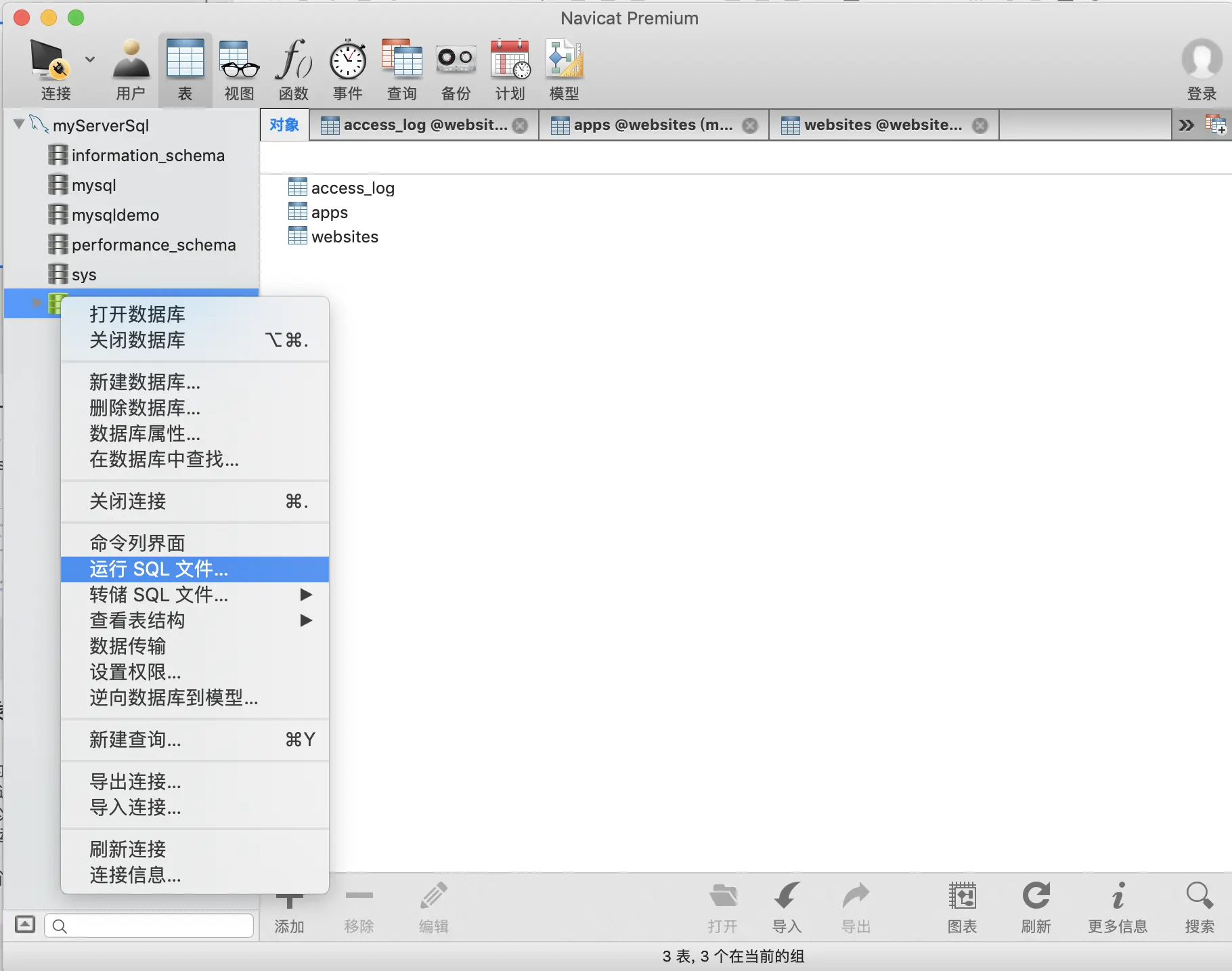 Navicat导入sql文件 hojztuh 2020-04-25 887 阅读1分钟 新建一个数据库,右键运行SQL文件 选择需要运行的sql文件后,点击开始即可 如果未在表中看到导入的目标Table,关闭Navicat,重新启动即可看到导入的Table