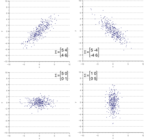 covariance matrix defines the shape of the data. Diagonal spread is captured by the covariance, while axis-aligned spread is captured by the variance.