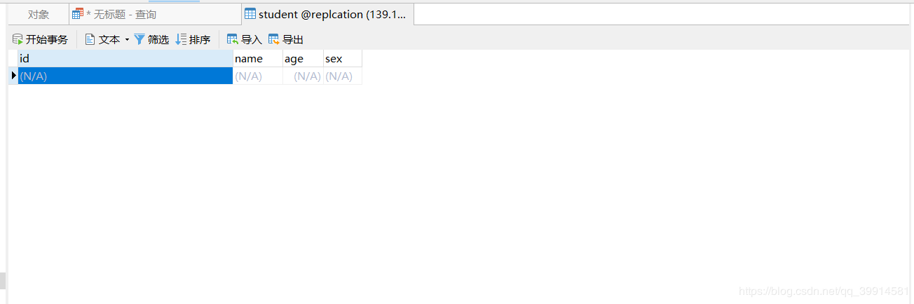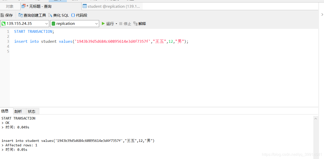 然后我在数据库手动开启了一个事务,并添加了一条学生信息(注意此时我并没有提交这个事务,所以在数据库的表中是查不到这个记录的)。