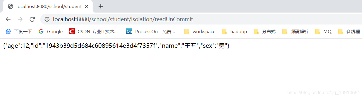 然后通过接口进行查询,可以看到这条数据已经被查了出来,然后我再把数据库中添加数据的事务给回滚掉(一定要记得回滚或者是提交,否则的话这个事务就会一直占用着这把锁)。这样用户就查到了一条不存在的记录,这也就是所谓的脏读现象。