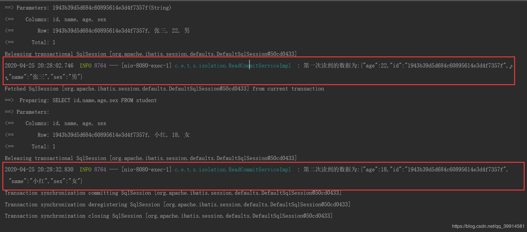 执行结果:同一个事务内两次查询同一条记录,却返回了不一样的数据(第二条数据是我在数据库手动修改的)