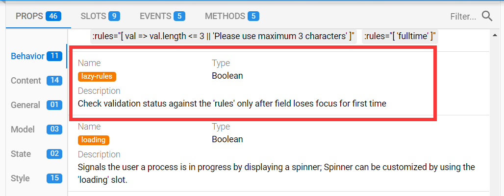 我一开始的思路是先去 Quasar 官网找 resetValidation() 相关的文档, 希望能有哪个选项不需要连同 lazy-rules 一起重置, 可惜并没有发现.