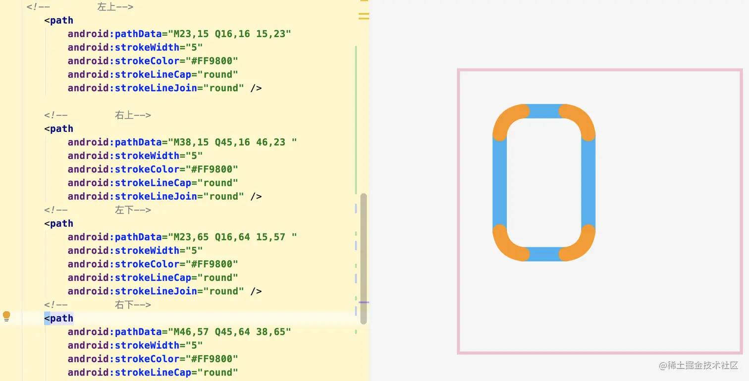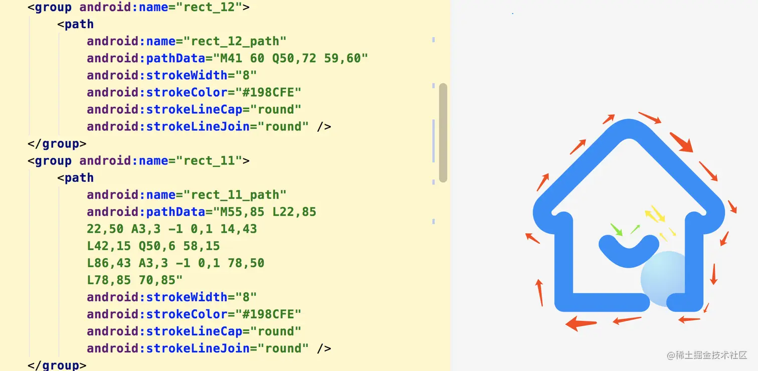M55,85 ,我们的画布(android:viewportWidth="100" android:viewportHeight="100")是100*100的,先标记出这个起点(55,85),很容易的,L22,85 22,50,后面的22,55前面没有英文字母,在AS中默认就是L,直接连线。22,50 A3,3 -1 0,1 14,43 含有A表示绘制圆弧,圆弧的两个点(22,50)(14,43),你问我半径为什么是3,3,我只能告诉你,这个是在AS中基于预览调试出来的,-1 0,1不用解释了。 L42,15 Q50,6 58,15 ,小屋的顶点是一个二阶贝塞尔曲线,左右对称的贝塞尔曲线是最简单的,右边圆弧,参考左边圆弧的点计算出来。最后的点连线就Ok了。