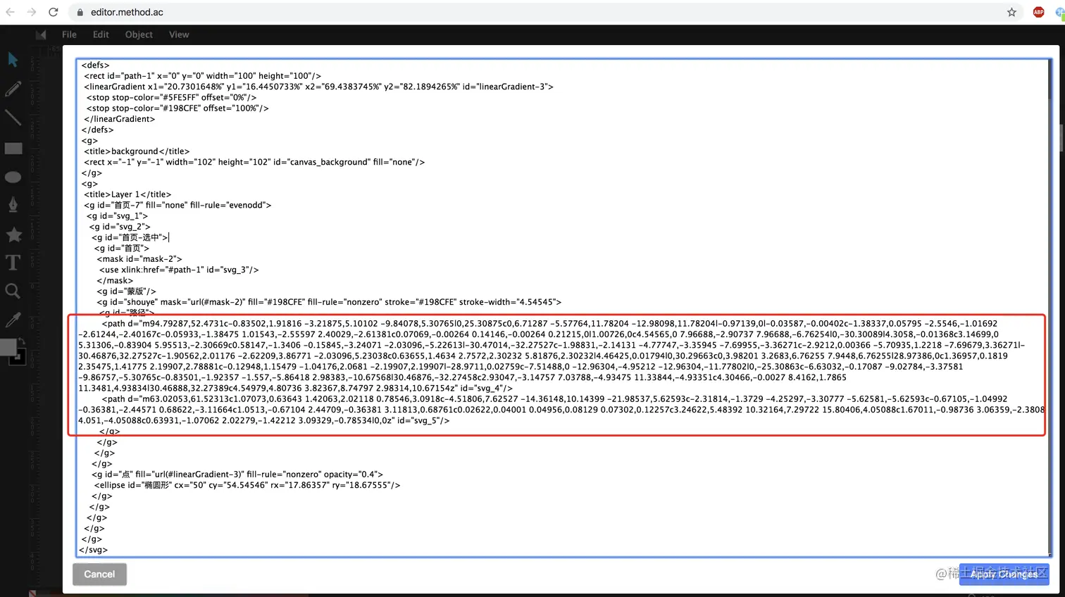 顿时去博客看关于矢量图动画的文章,了解到可以让UX提供icon的svg,从svg中获取path,经过半天的努力,等来了svg,导入在线svg编辑,查看path并直接导入到我们的vector中