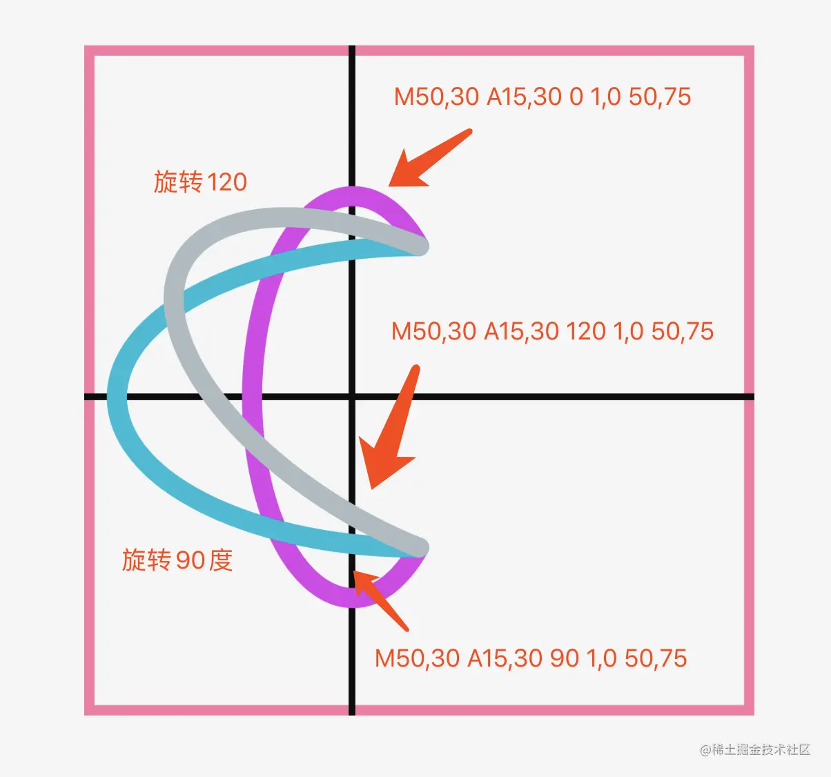 举例:M50,30 A25,30 -100 0,0 50,75 效果如下: