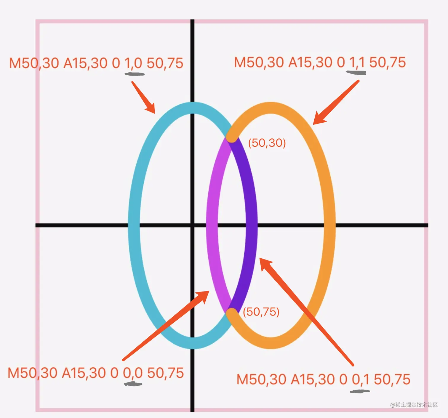 0,0 是标记绘制大弧(1)还是小弧(0)部分 + 标记向顺时针(1)还是逆时针(0)方向绘制。 50,75 是圆弧终点的坐标。