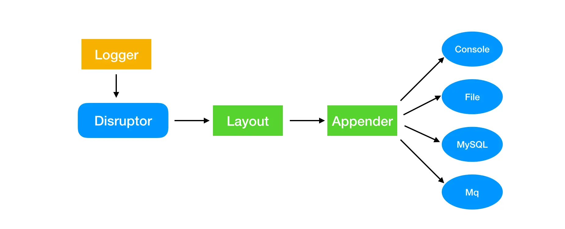 Disruptor 有着非常好的性能,刚好满足上面我们所提到的要求,在 Log4j2 中加上 Disruptor 之后,我们的日志处理流程就变成了下面这样: