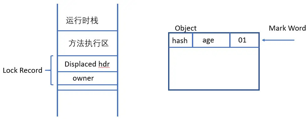 如果同步对象没有被加锁,那么虚拟机将会在当前线程栈帧上创建Lock Record锁空间,用于存储锁对象目前的Mark Word拷贝。如下图所示:
