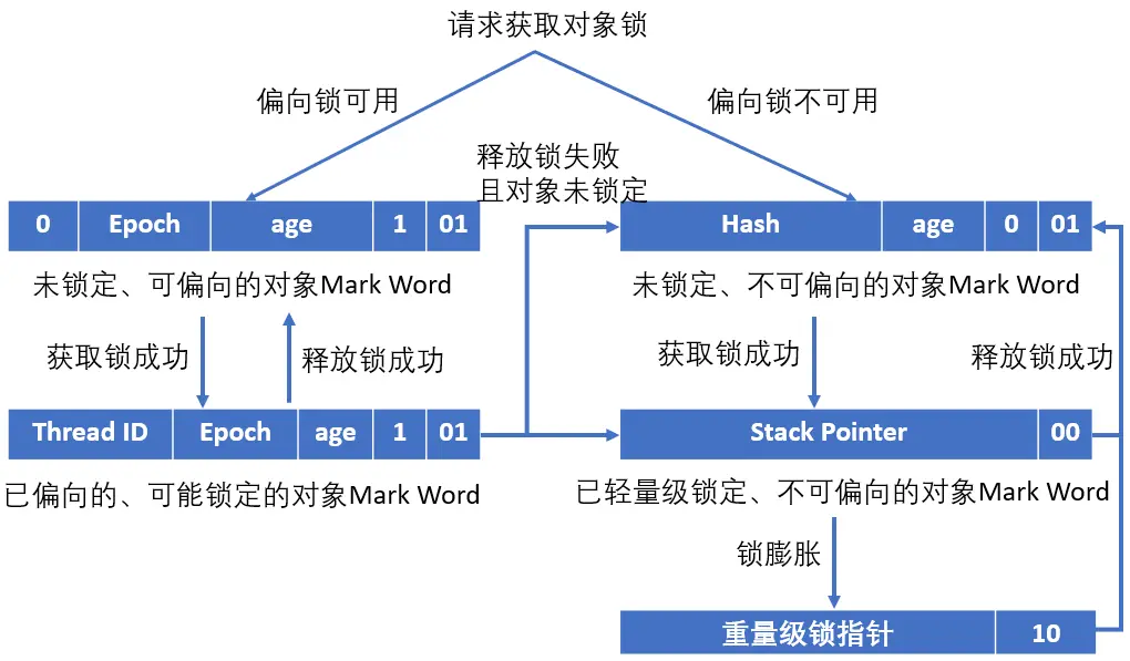 JDK1.6开始,加锁的状态有3种:轻量级锁、重量级锁和偏向锁,这几种状态随着竞争程度的提高不断升级,锁可以升级但是不能被降级。升级的过程,锁的标志位不断自增1,对象头信息会根据锁的状态复用自己的存储空间。