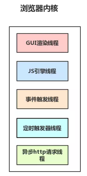 - 异步http请求线程:在XMLHttpRequest连接后是通过浏览器新开一个线程请求。将检测到状态变更时,如果设置有回调函数,异步线程就产生状态变更事件,将这个回调再放入事件队列中。再由JavaScript引擎执行。