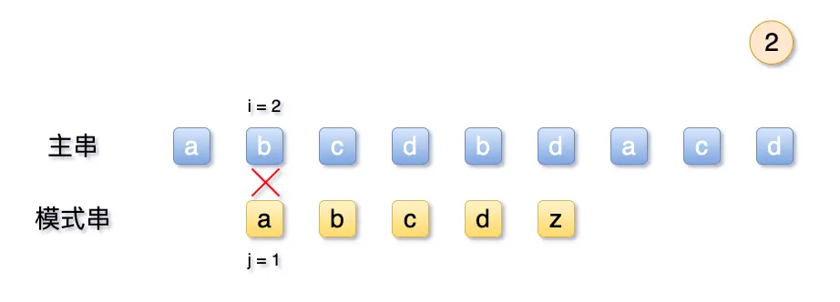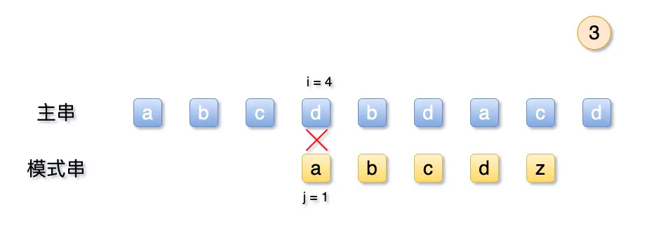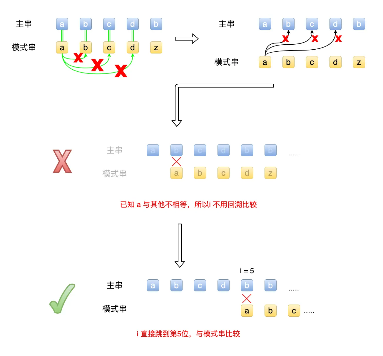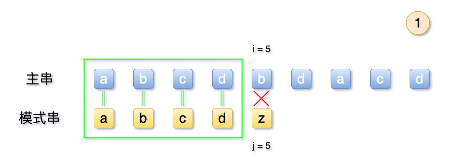 由于的abcd 均不相等,而第5位失败后,我们可以轻易得知,模式串首位a 与主串的前4位均不相等,故可以直接将主串的 i 移动到第5位与模式串相比。