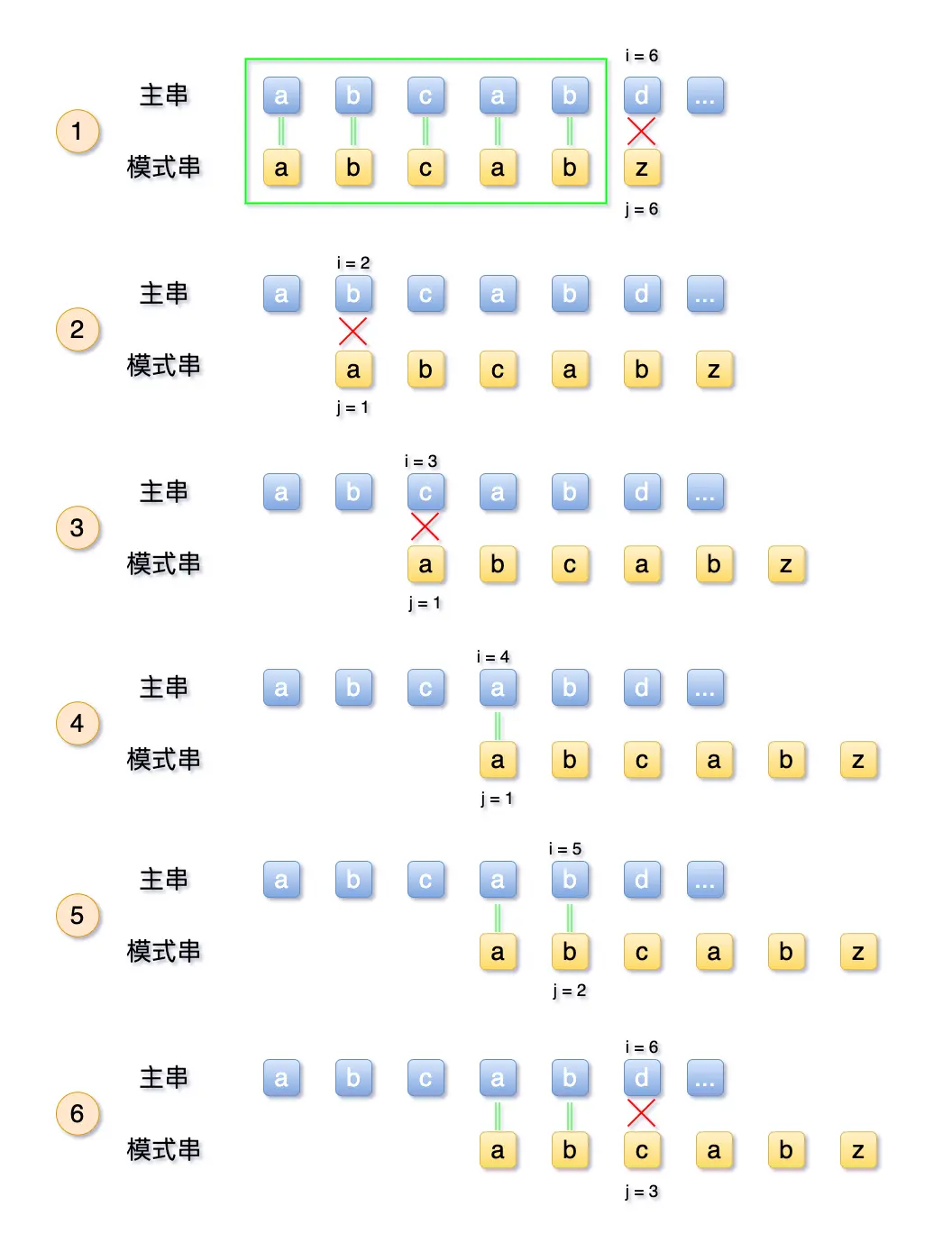 可见,由于模式串中首位a 与第二、三位的b、c 均不相等,所以第2、3步均为多余步骤,可以跳过。