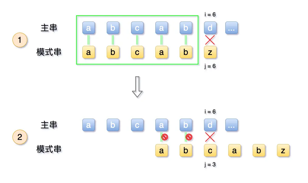 而在场景B中,由于模式串中的 T = abcabz,ab 是重复的,此时 j 跳到了3(重复数2)。