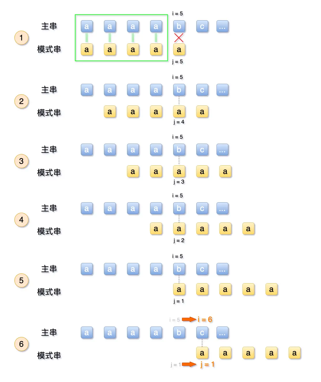 而此时a 不等于 b,再次回溯,以此类推,一直到第5步,发现回溯完后,T 中的a 一直不等于b,不得不放弃回溯,直接将S 中的 i 增加,跳到下一个字符。