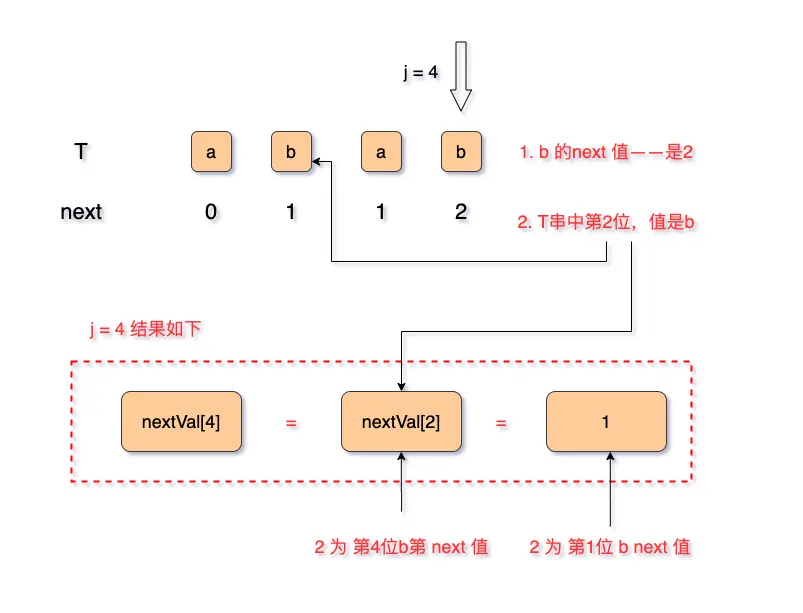 - j = 4 ,此时为新情况,左边为T [4] = b,右边 T[next[4]] = T[2] = b 这种前后字符相等,使用新逻辑:nextVal[4] = nextVal[2] = 1;