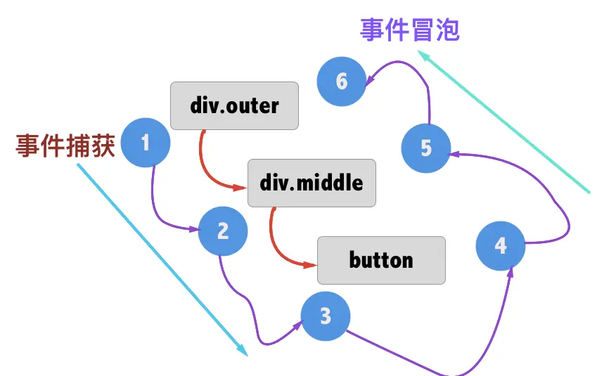 捕获事件:嵌套两三层父子关系,然后所有都有点击事件,点击子节点,就会触发从外至内 父节点-》子节点的点击事件
