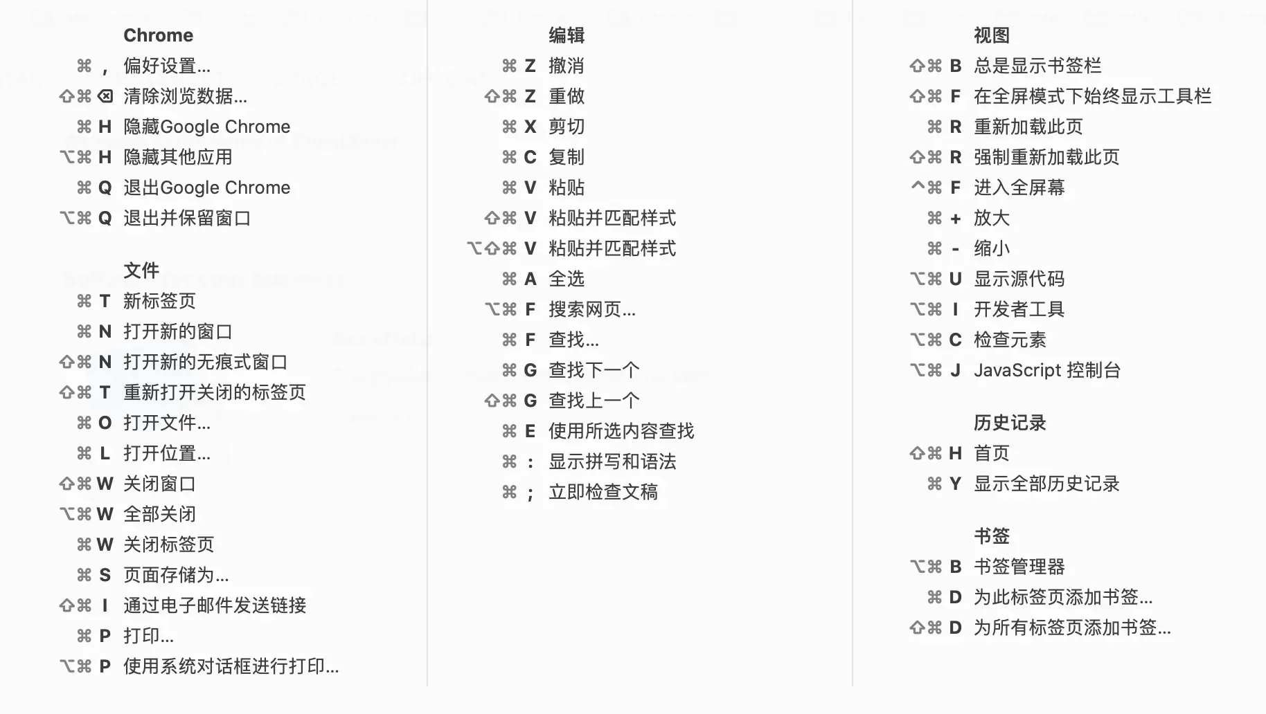 你只需长按一下 ⌘ 键,就可以得到当前应用程序的所有快捷键的列表,就是这么简单: