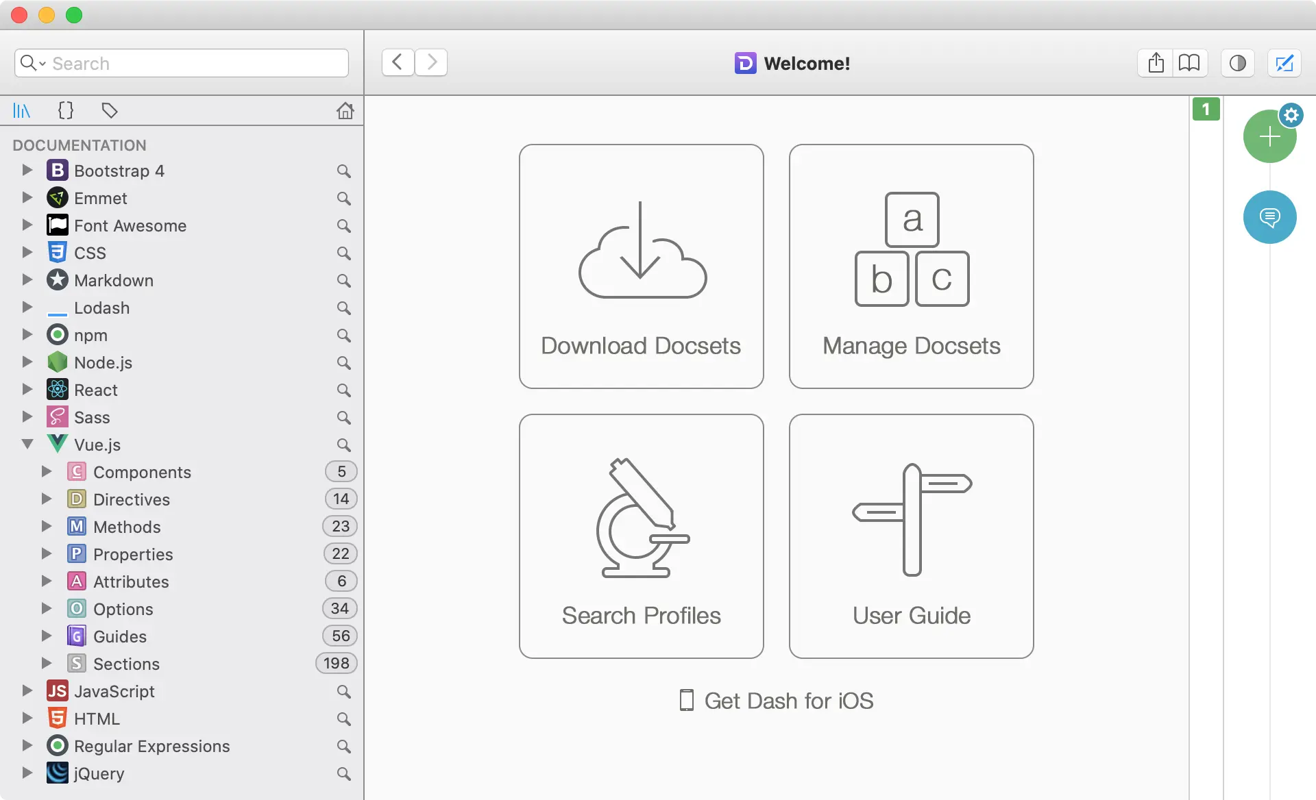 Dash 是一个 API 文档浏览器和代码片段管理器,它里面包括了许多开发用到的语言或者框架,您甚至可以用它生成自己的文档集: