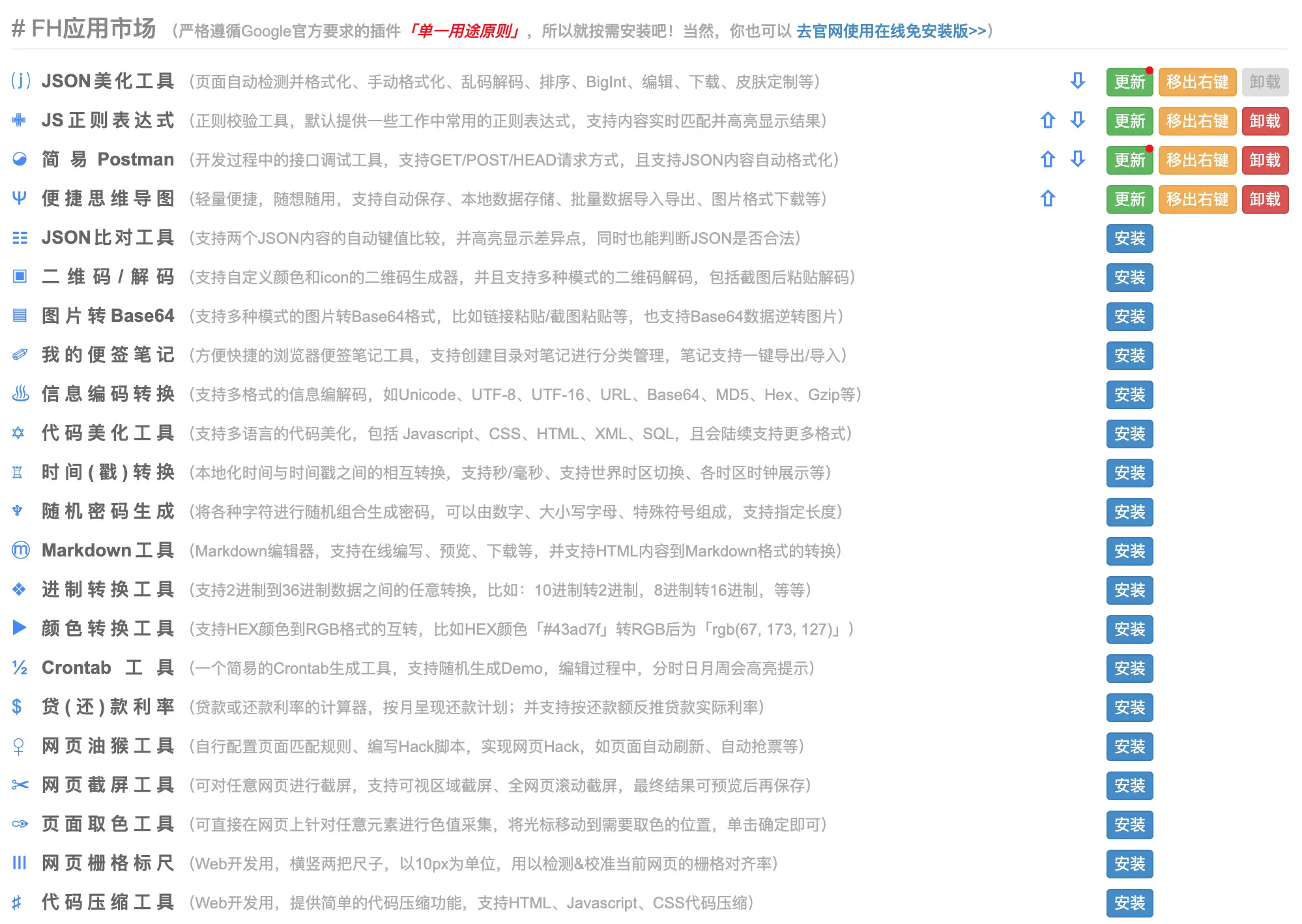 FeHelper 是一个非常实用的 Web 开发者助手,其应用市场包含了大量的内部扩展: