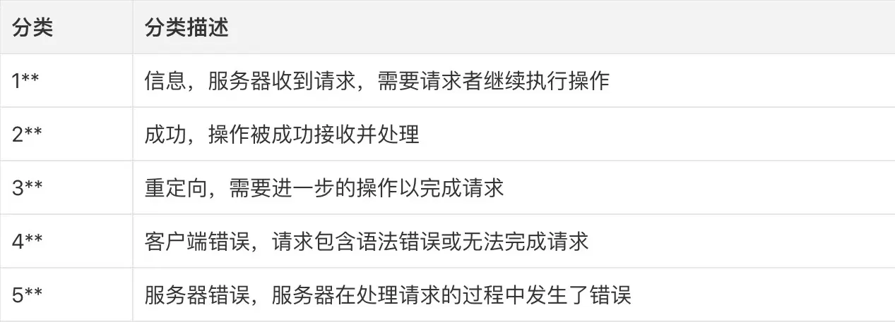 HTTP协议状态码由三位的数字组成,第一位表示状态码的类型,后面两位没有分类作用。HTTP状态码共分为5种类型: