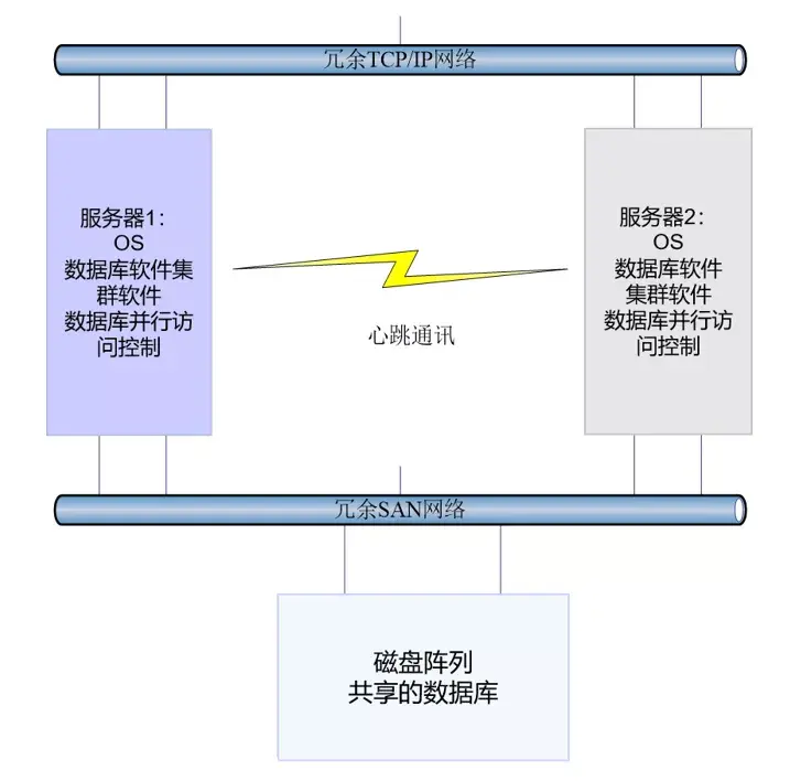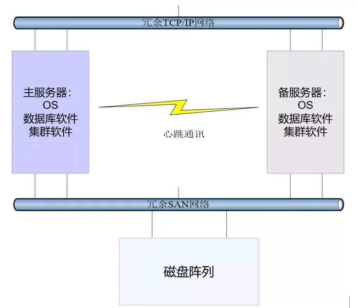 主备服务器上都安装了数据库软件和集群管理软件,并且都能够通过SAN网络访问磁盘阵列。在正常情况下,主服务器启动数据库进程(备服务器上并不启动数据库进程),并访问存储在磁盘阵列中的数据库;集群管理软件在主备服务器上都启动,监控服务器/网络/IO/数据库进程状态并提供一个虚拟IP地址(在主服务器上)供应用访问。